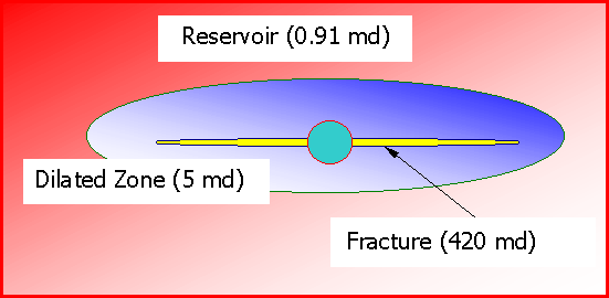 A homogeneous model. This "Homogenized" model incorporates a fracture, surrounding zone of enhanced permeability and porosity (blue) and an unfailed zone. This representation has been successfully used for oil sands, chalk, coal