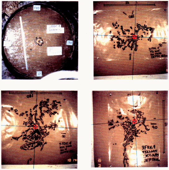 At high injection rates, complex dendritic fracture systems developed. At low rates, plastic deformation around the wellbore can afford development of a single wide fracture. This is supported by experience at the Alberta Research Council. The question remains whether these particular measurements can be translated to field conditions. In the figures, for injection into a sand pack with a high viscosity saturant, "fracture" morphology is shown at different depths into the vessel. Extremely complex systems develop, partly in response to the low stress environment and the mobility contrast. Apparently, some parts of this system were unconnected to the wellbore (or connected in a very tortuous path)!