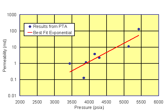 In addition, PTA or simulation analysis of SRT can provide very useful indications. Step rate testing (SRT) is preferable to single rate injection test. Conventional laboratory measurements provide useful data. The example below shows stress-dependent permeability for Oriskany sandstone. The interpretation was based on PTA and fracture modeling. Field testing is a valuable addition (or sometimes the only alternative) to laboratory work and its advantage is that it measures both matrix and fracture properties, integrated over a larger area. However, proper interpretation of the data requires sophisticated tools.