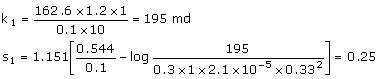 The slope mq1 is 0.1 psi/STB/D. The permeability and the skin are: