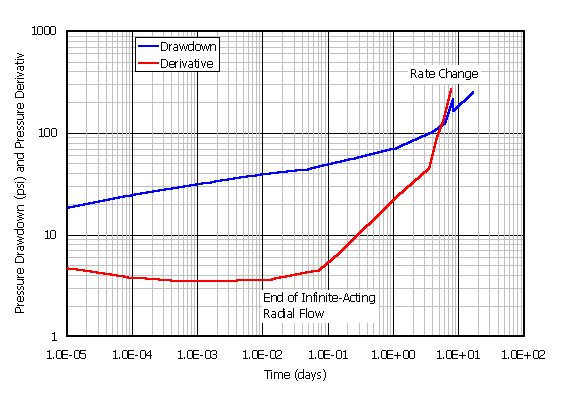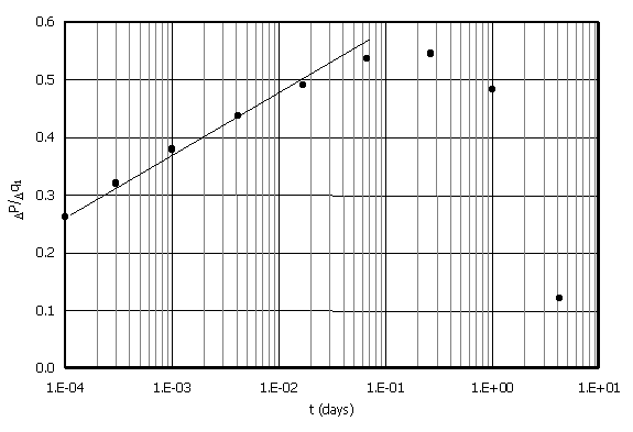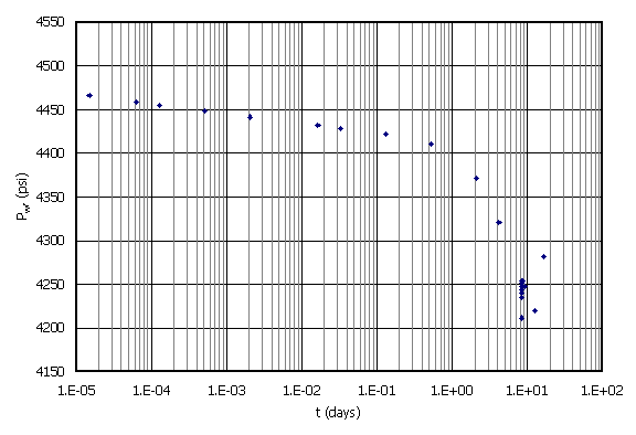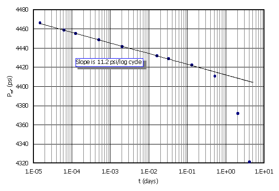 The variation in bottomhole pressure versus time (it is a flowing situation but the same concepts apply to injection) is shown in Figure 9 (Cartesian and semilog).