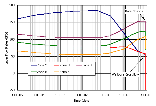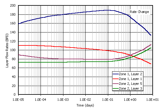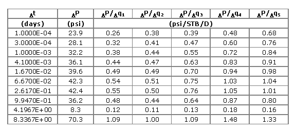 This is a five layer case. The pressure-rate history for the five zones is shown below. NOTE THAT THE CALCULATIONS THAT FOLLOW ARE VERY SIMPLIFIED - FOR DEMONSTRATION PURPOSES ONLY - YOU SHOULD READ THE REFERENCE AND CONSULT WITH YOUR PTA SPECIALIST.