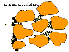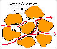 | Surface Deposition In this phase, the kinetics of this deposition is strongly anisotropic. The effect of particle deposition on permeability is significant only if it takes place in pore throats. Thus permeability reduction is not related to the total amount deposited but only to the fraction deposited in pore throat area. |