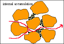 | Internal Cake Formation When the fraction of bridged pore throats reaches a critical value, the pores are no longer connected over some critical characteristic depth (damage depth). Then all the incoming particles accumulate not only upstream from the bridged pore throats but also inside all pore bodies still accessible, forming what is called internal cake. |
