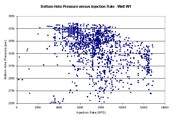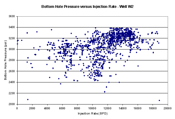 Figure 2. Bottom hole pressure versus injection rate. From this figure and considering the large skin (500) from fall-off test, one may conclude that the injector was under matrix injection.