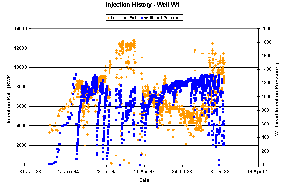 Figure 5. Wellhead injection pressure and injection rate history plot for well W1.