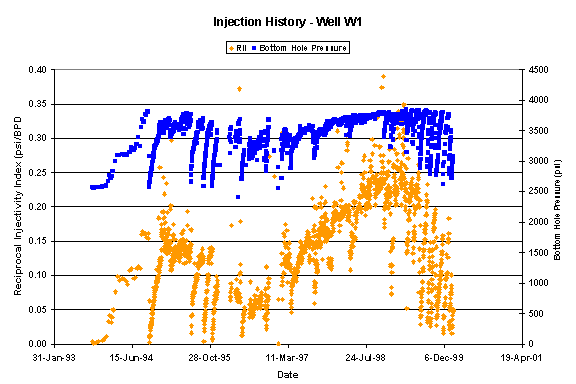 Figure 6. Bottom hole pressure and reciprocal injectivity index history plot for well W1.