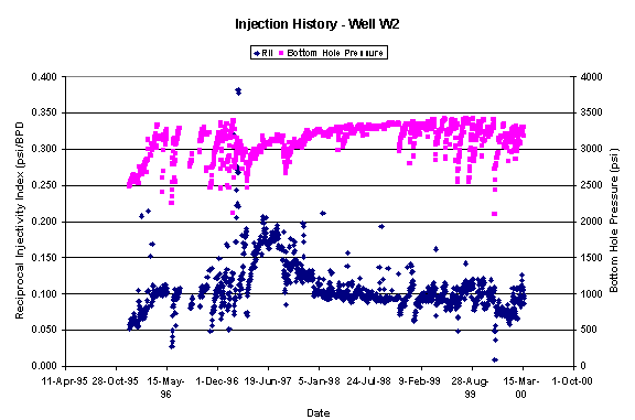 Figure 9. Bottom hole pressure and reciprocal injectivity index history plot for well W2.