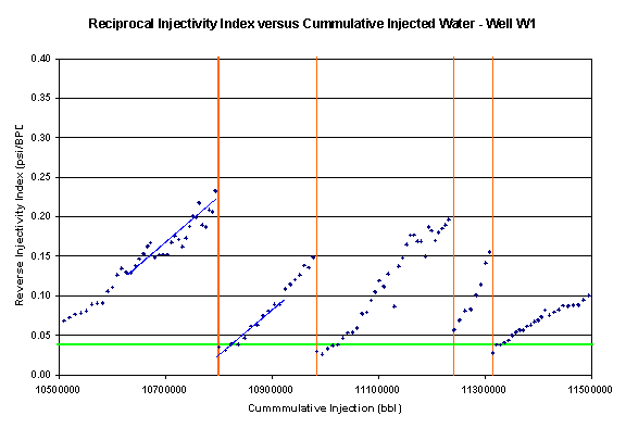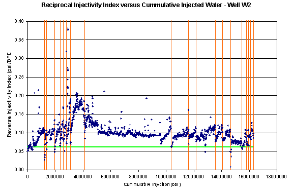 Figure 7. Reciprocal injectivity index versus cumulative injected water volume. Also plotted in this figure are the indicators of stimulations (vertical line) and the base-line value (horizontal line).