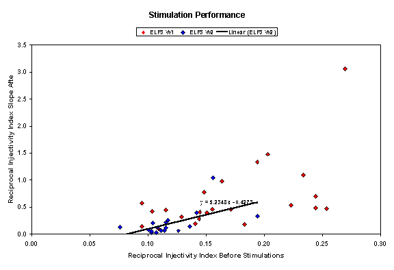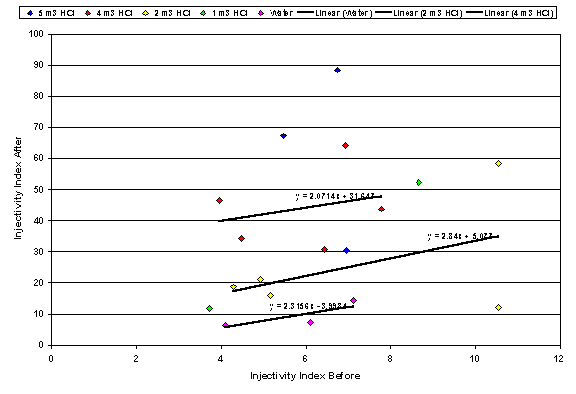 2. Correlation was developed to estimate initial after-stimulation injectivity index or improvement ratio from pre-stimulation injectivity index or from the normalized pre-stimulation reciprocal injectivity index.
