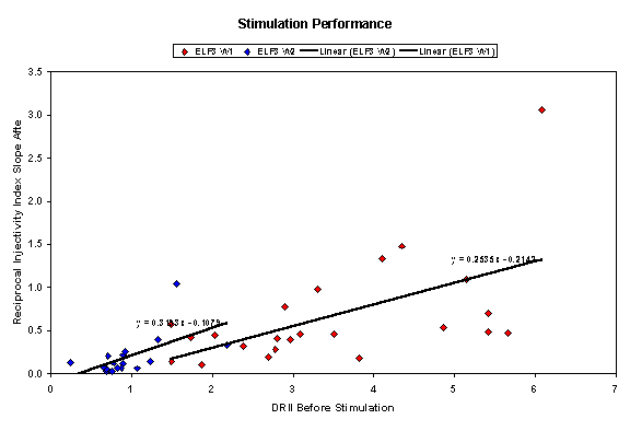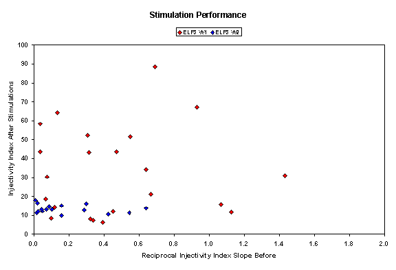 Two parameters are defined here in presenting the stimulation results. One is improvement ratio, which is defined here as the ratio of the injectivity index after the stimulation to the injectivity index before the stimulation. It is a measure of initial stimulation performance. The injectivity indexes are determined from the intersection values. Another parameter normalized reciprocal injectivity index, DRII, is defined by the following equation: