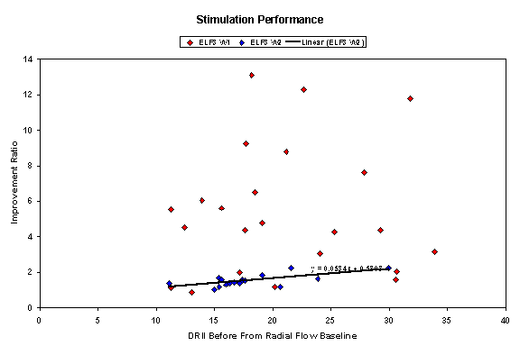Figure 15. Cross plot of improvement ratio and DRII, which is defined as the difference of the reciprocal injectivity index from its base-line value, normalized by its base-line value. The base-line value is the value from radial flow. Different acid volumes were used in the stimulations for well W1 and there is quite large scatter of results, as seen in the plot. Stimulation results from well W2 show a much smaller scatter. This may be because stimulations on well W2 were done with relatively consistent acid volume, varying from 0.8 to 1.6 m3 or 5 to 10 barrels.