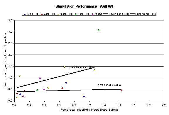 Figure 17. Cross plot of reciprocal injectivity index slope per 1 million barrels of injected water after the stimulation versus the slope before the stimulation. This is a plot for Well W1 only with different stimulation volumes.
