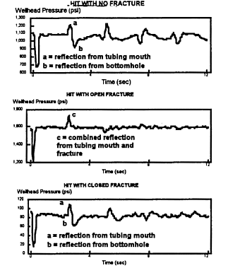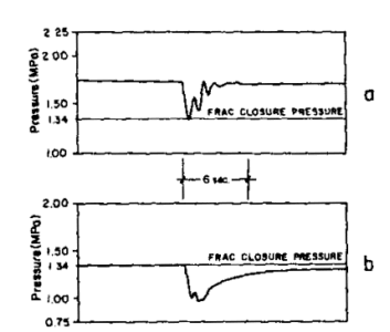 Figure 9 shows measurements in a hydraulically fracture well (in a cased hole) at Mounds, Ok. "The first oscillations were recorded when the wellbore pressure was about 0.4 MPa above the statically determined fracture closure pressure. The oscillations continued for several cycles before damping out (Figure 9a). In contrast, they damped out almost immediately after excitation at fracture closure pressure (Figure 9b). Subsequently, free oscillations were initiated above fracture closure pressure after different volumes of water had been injected into the already created fracture. In every case, greater volumes were characterized by reduced rates of attenuation of the oscillations (Figure 10)."3
