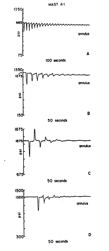Holzhausen and Egan, 1986,5 provided some additional examples. Measurements were done in a test well, completed in a tight gas sand, in the Travis Peak formation, in East Texas. There were 27, 0.35-inch diameter perforations from 8830 to 8872 and there was a bridge plug at 9450 feet. The tubing was 2-3/8-inch and the casing was 5-1/2-inch. There were surface pressure transducers on the tubing and the backside. The records of the free oscillations are shown in Figures 11a through 11d.