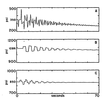 Figure 12. Measured free oscillations in 2 Deep Seam 30-4: (A) before treatment, (B) immediately after injection of 75 bbl of water, (C) 23 minutes after same injection.