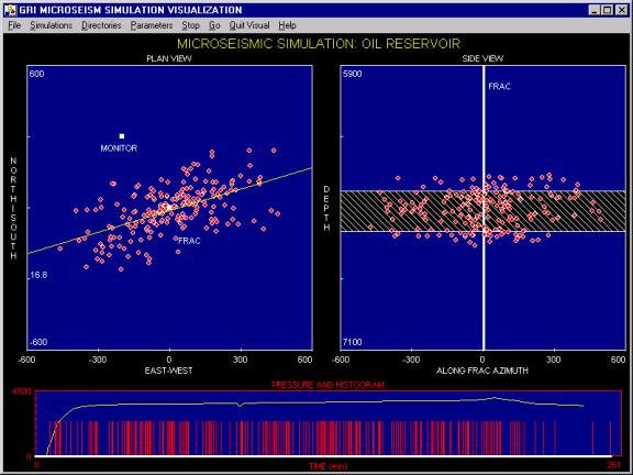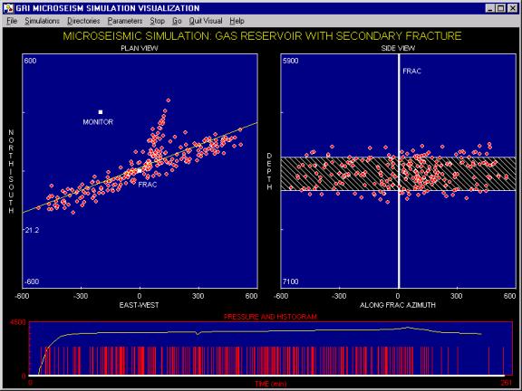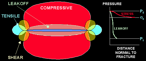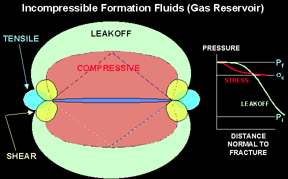 Microseisms originate in an envelope around a hydraulically induced fracture. This envelope provides indications of the height, length, azimuth and indicates any asymmetrical growth characteristics (i.e., may grow more in one direction than another - up dip for example). The events that you are dominantly seeing are fluid loss indiced slippage in fractures around the main treatment. Figure 7 is a schematic example. The response of the formation around the fracture depends on the compressibility of the native fluid. In a reservoir with a compressible fluid, Figure 8, the pressure in the "remote" fractures is altered only locally to the mother fracture system. In a reservoir with a slightly compressible fluid (oil or injected water) pore pressure alteration around the fracture extends farther away (Figure 9).