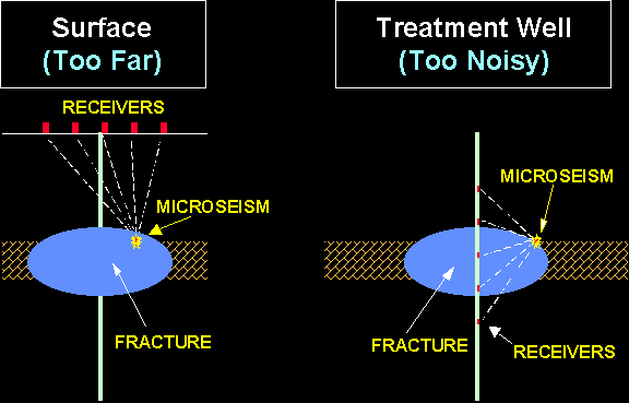 The microseisms that are generated as a result of injecting into a hydraulic fracture are quite weak. Receivers placed at the surface are, in most cases, too far away to reliably detect these signals. On the other hand, if sensors are placed close to the injection zone in the well that is being injected into, there is too much noise from the pumping operations themselves (Figure 3).