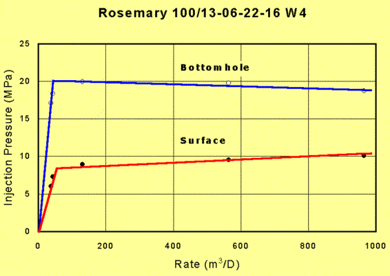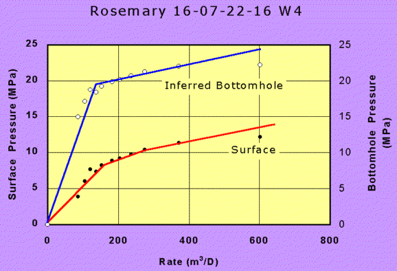Figure 12.  Plot of surface pressure versus rate for an actual step rate test. The bottomhole pressure was estimated, accounting for the hydrostatic head and frictional effects.