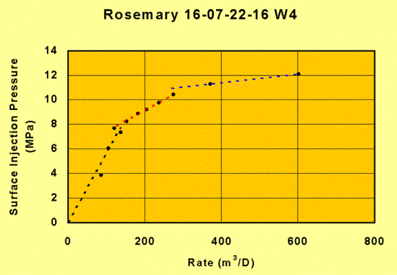 Figure 13.  Plot of surface pressure versus rate for an actual step rate test, emphasizing the difficulties in picking inflection points, or multiple mechanisms occurring (such as reopening a pre-existing fracture, more than one fracture opening, etc.).