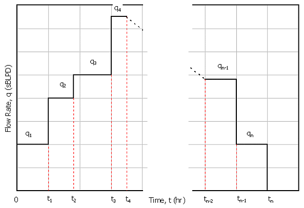 Figure 15.   A schematic representation of a step-rate test. The nomenclature indicates the parameters to be used in multi-rate test analyses.