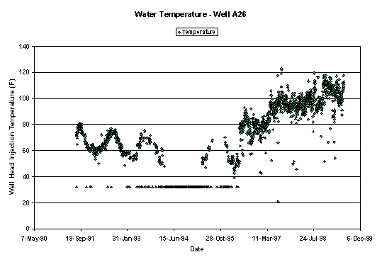 Figure 1. Wellhead temperature history. The temperature was initially between 60 and 80°F. Starting in the summer of 1996, the water temperature began to increase gradually to over 100°F. This temperature increase is assumed to be due to a gradual increase in the produced water portion of the water blend that was injected.