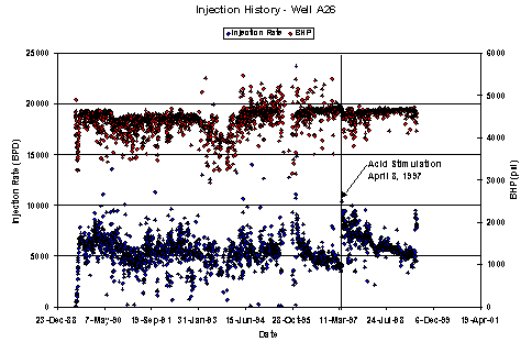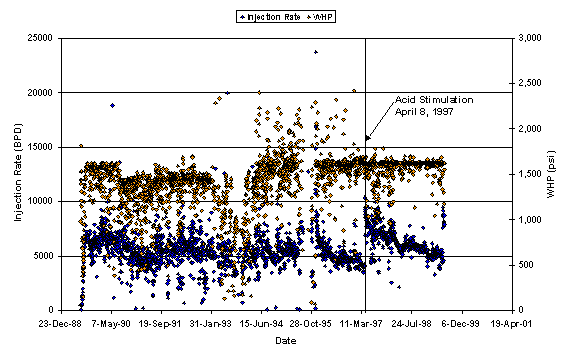 Figure 3. Wellhead injection pressure and injection rate history plot. Two clear features can be seen from this plot - there was an increase in wellhead pressure beginning in the summer of 1994 and there was an obvious increase in the injection rate right after acid stimulation. There was also an obvious increase in the injection rate towards the end of 1995. It is suspected this was due to shut-in and restart of the injector as there was a period of 2 months of missing data.