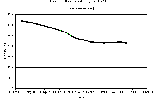 Figure 5. Reservoir pressure as a function of time. There are over 2 months of missing data between August 1995 and October 1995. The second step in any reasonable analysis is to ensure that you understand the average reservoir pressure.