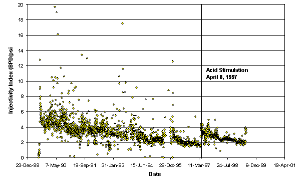 Figure 11. Injectivity Index before and after the stimulation on April 8, 1997 for a number of wells where acid was bullheaded or injected on-the-fly into the fractures.