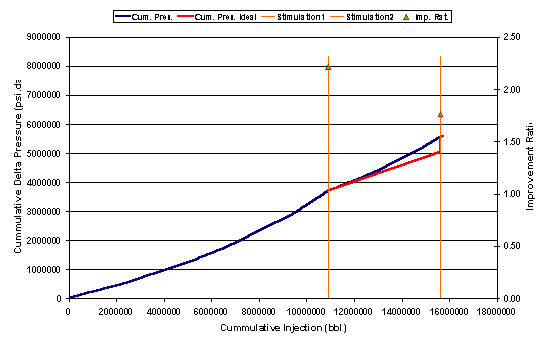 Figure 7. Next look at the Hall plot. Plot the conventional Hall plot information. Superimpose an ideal Hall plot immediately after the treatment and extrapolate this ideal situation ahead in time (assuming no further damage after stimulation). Calculate the improvement ratio for the treatment (ratio of the Injectivity Index after the stimulation to that before stimulation). There is a clear benefit to the stimulation in this situation. The benefit is sustainable (does not deviate from the ideal Hall plot) for quite some time.