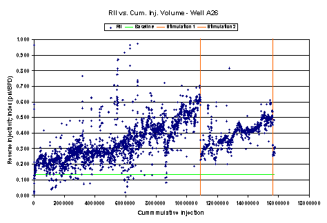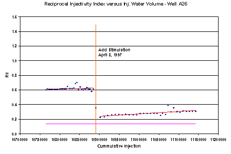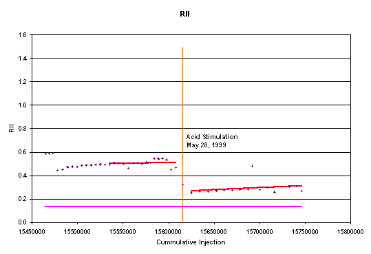 Figure 10. Reciprocal injectivity index versus cumulative injection volume near the stimulation on May 28, 1999. A thirty-day linear fit was used to define the Improvement Ratio and the slope - to describe how fast the stimulation benefits will diminish. A good stimulation yields a relatively high Improvement Ratio and a small slope after stimulation.