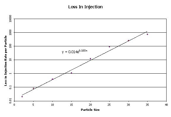 In Figure 10, there is a reasonable correlation between the loss in injection rate per particle and the particle size on a logarithmic scale. An exponential function can be fitted to this.